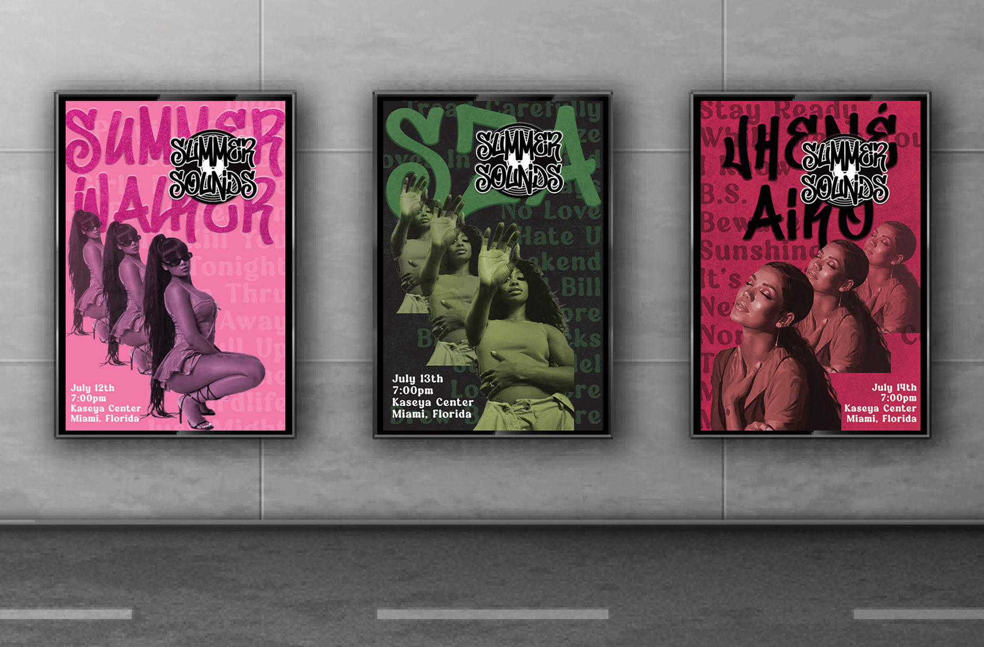 I created a cohesive visual promotion for a summer concert series named "Summer Sounds." I developed branding materials, promotional items, and a consistent theme that engages the target audience and communicates the essence of the event. I worked within the brand guidelines I created to keep a cohesive look. The event entails three events in total, three different dates, and three different R&B artists.